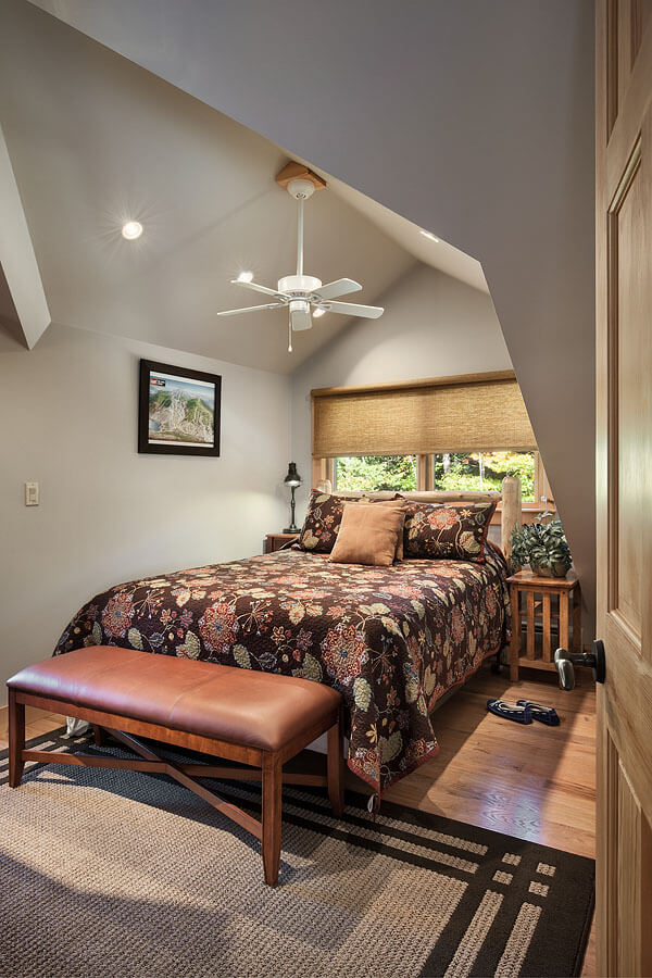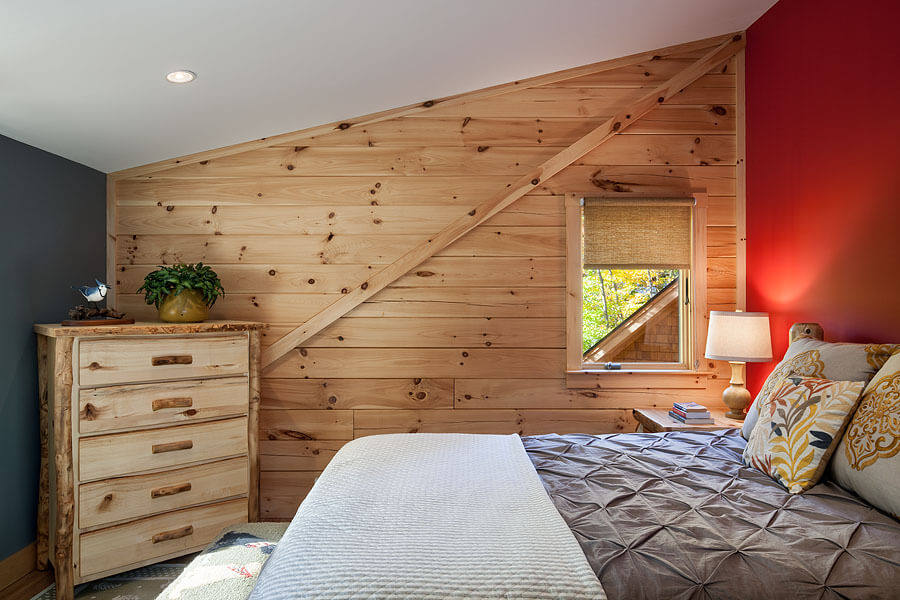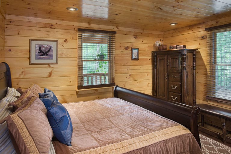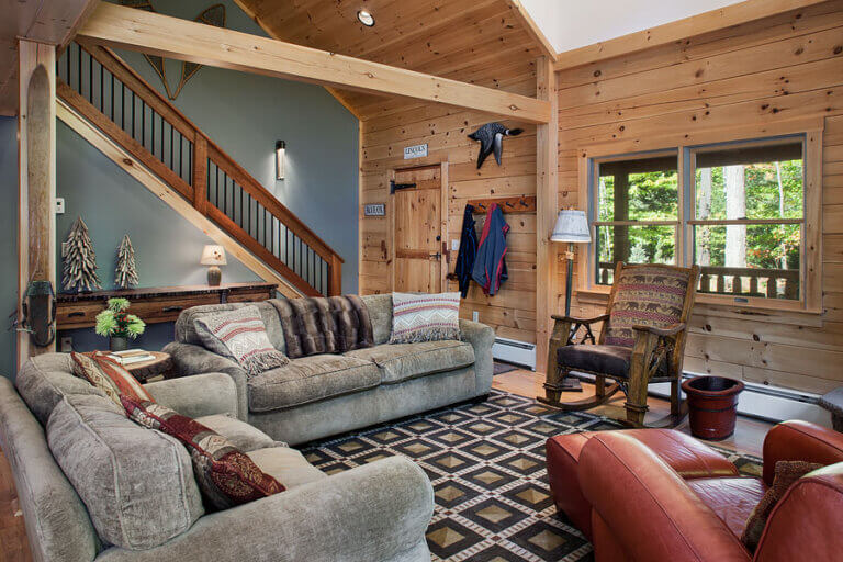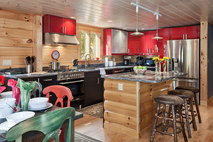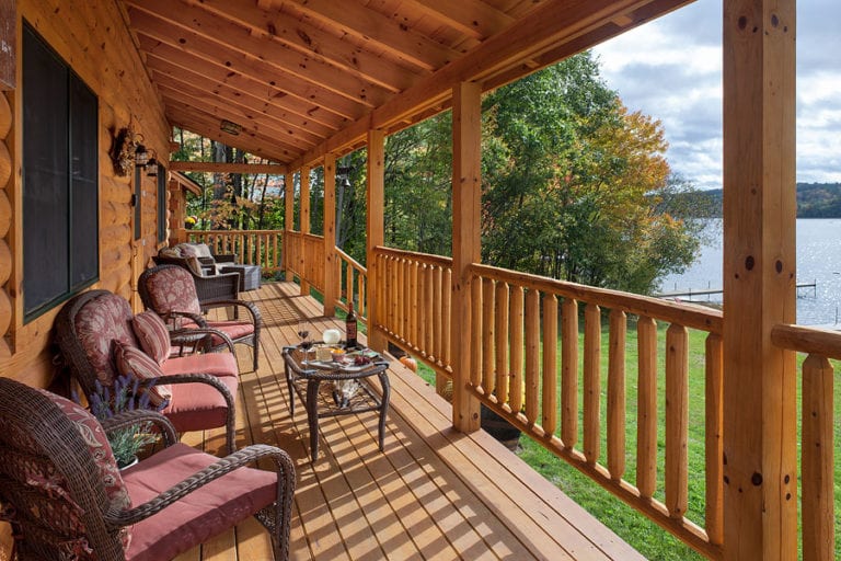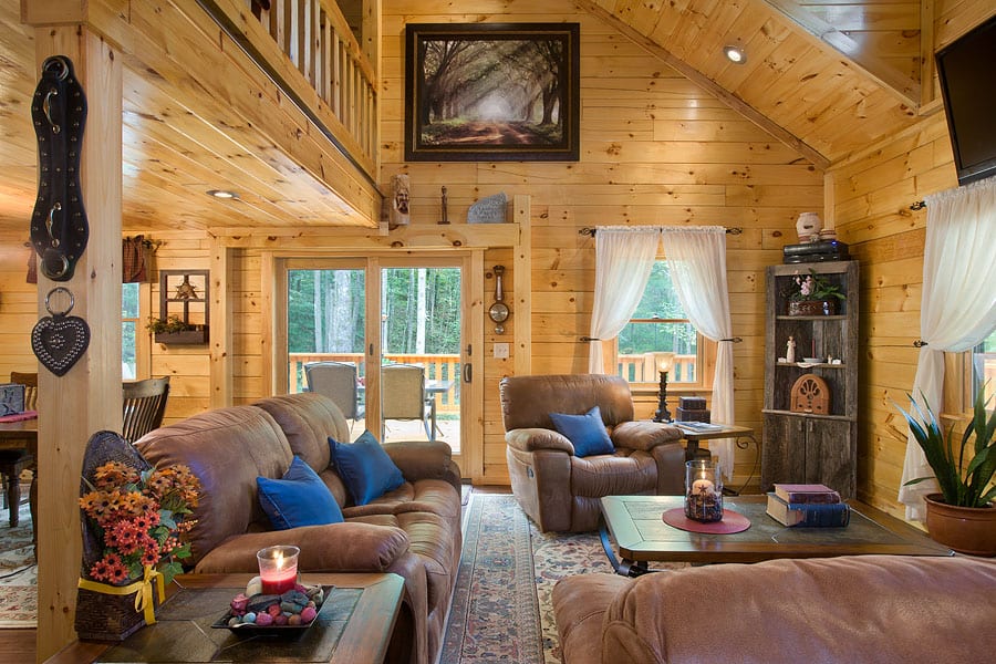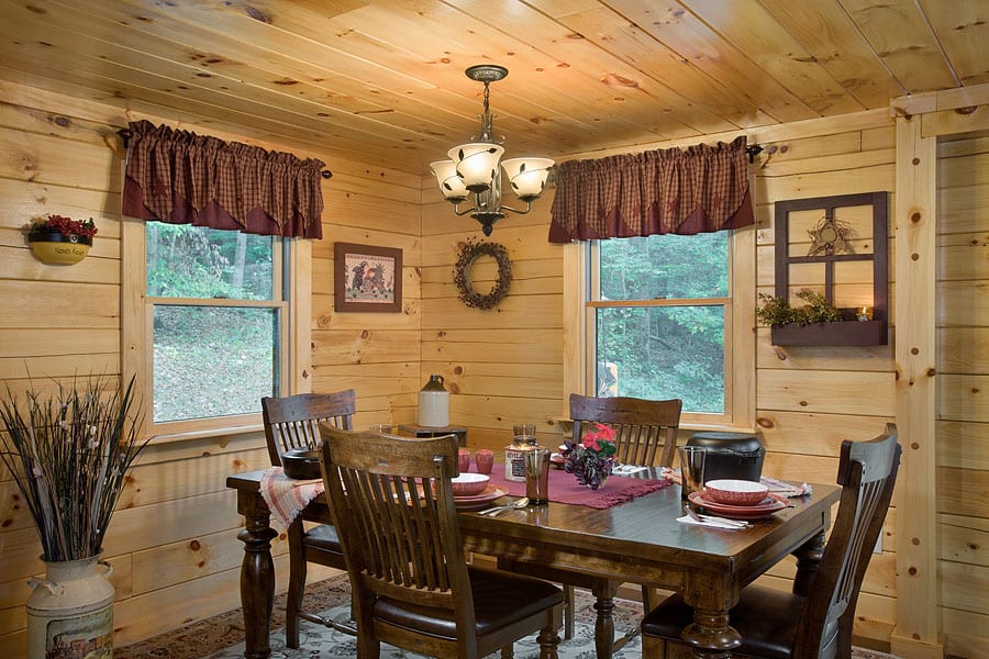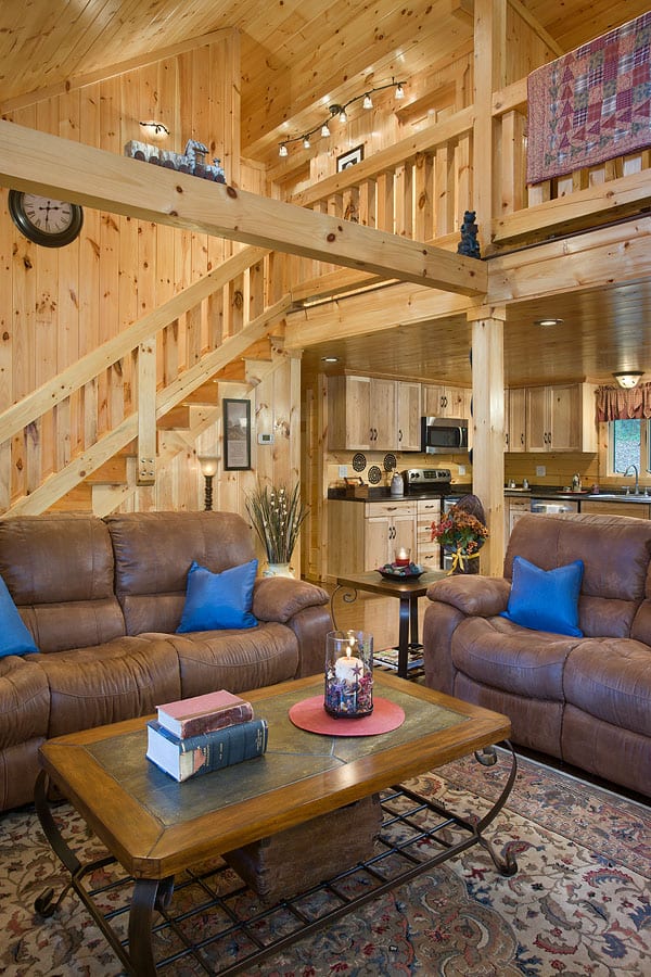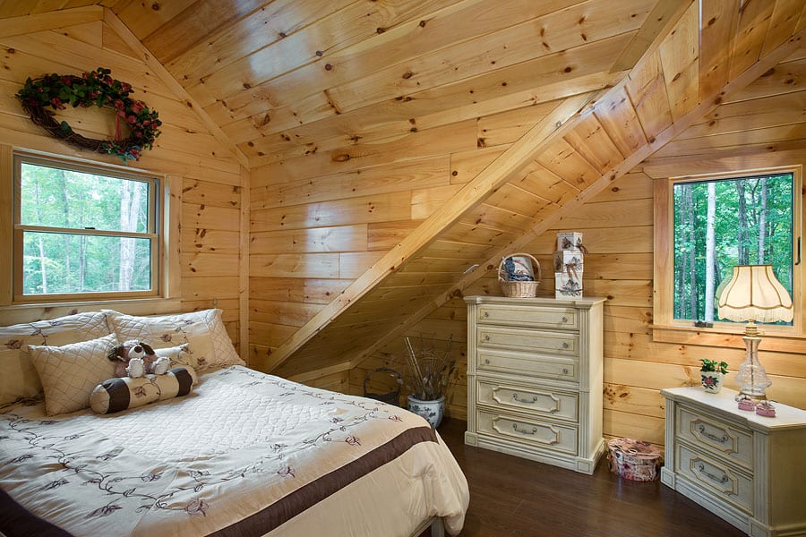 One of our most popular log home designs, this model offers all the right amenities. A covered front porch offers additional outdoor living space while a sliding glass door off the dining/living area invites in the sun. The master suite is on the first floor with a walk-in closet as you enter the master bath. The entrance is grand indeed as the cathedral ceiling over the living area, the stairway and railings add majestic log home charm. A shed dormer on one side and two gabled dormers on the other, boost its functionality and aesthetic value to the upstairs rooms and loft.