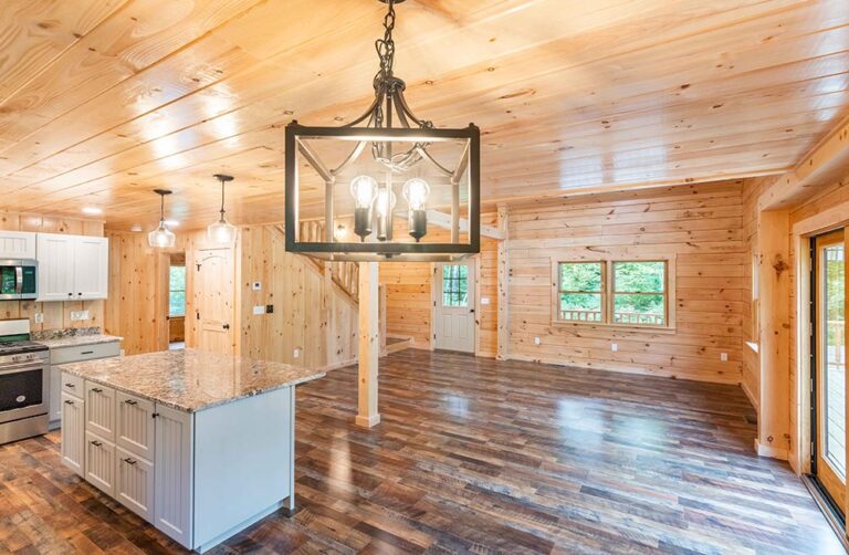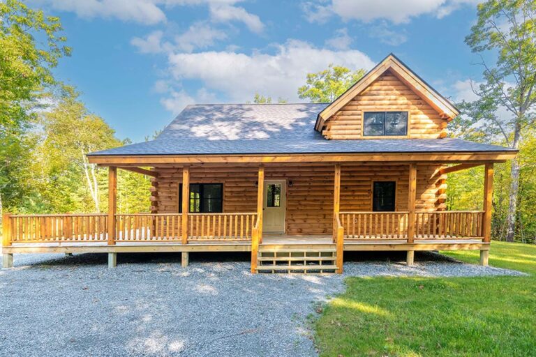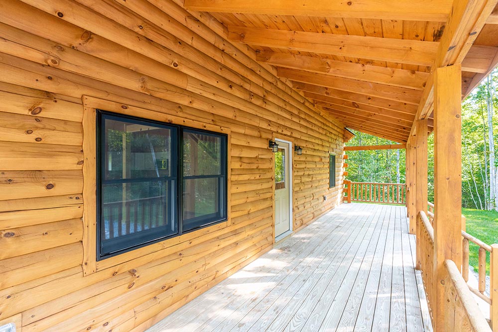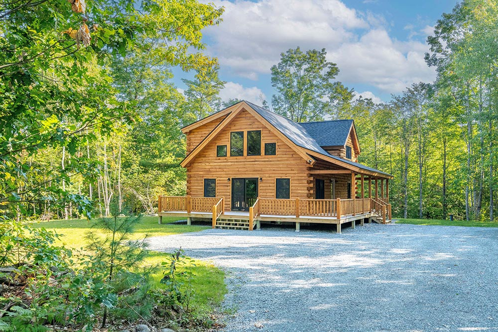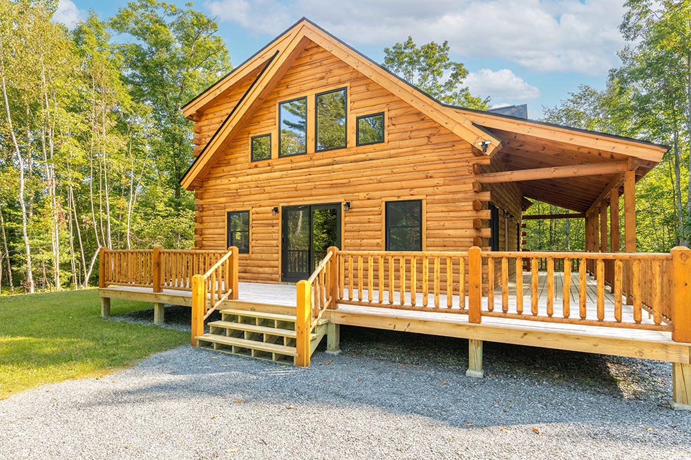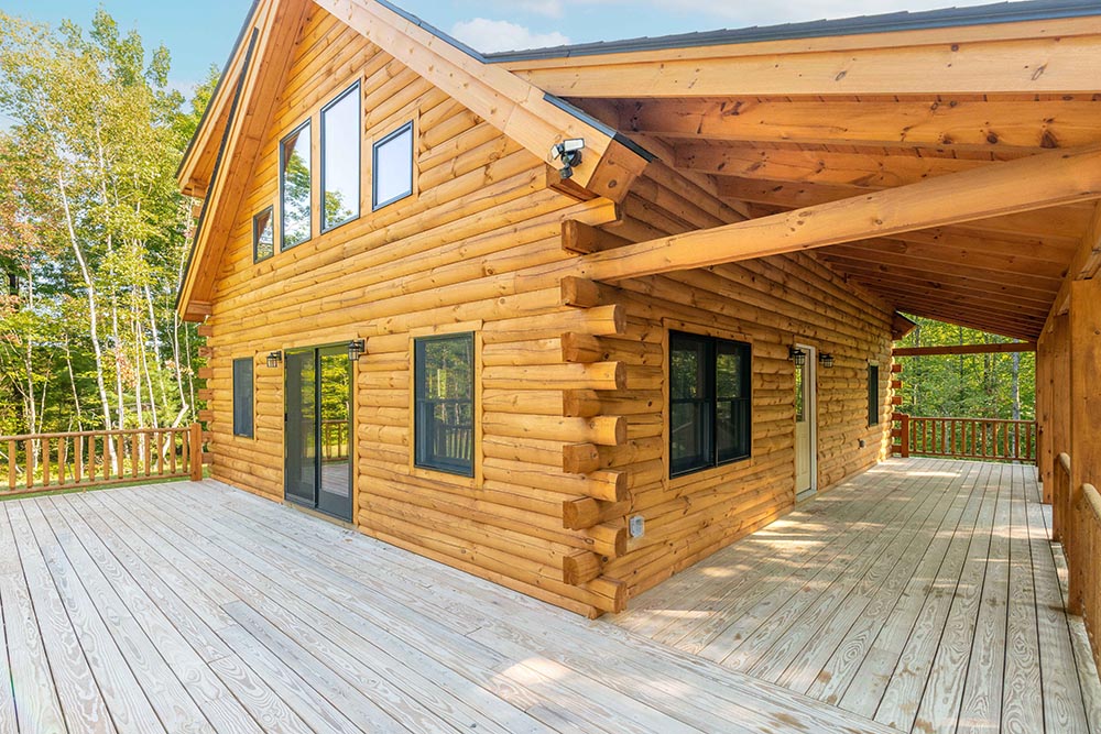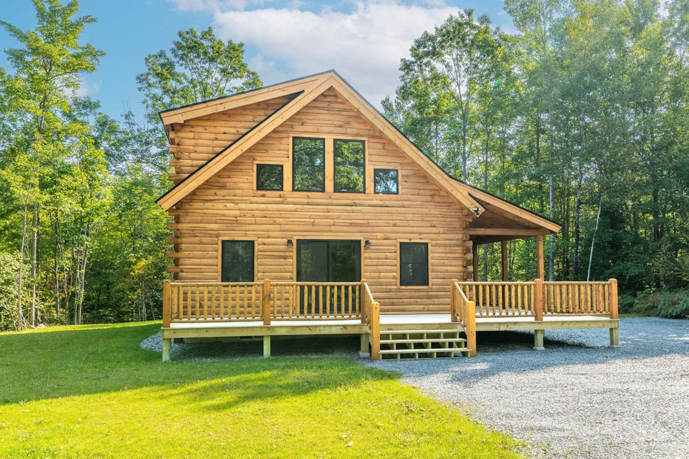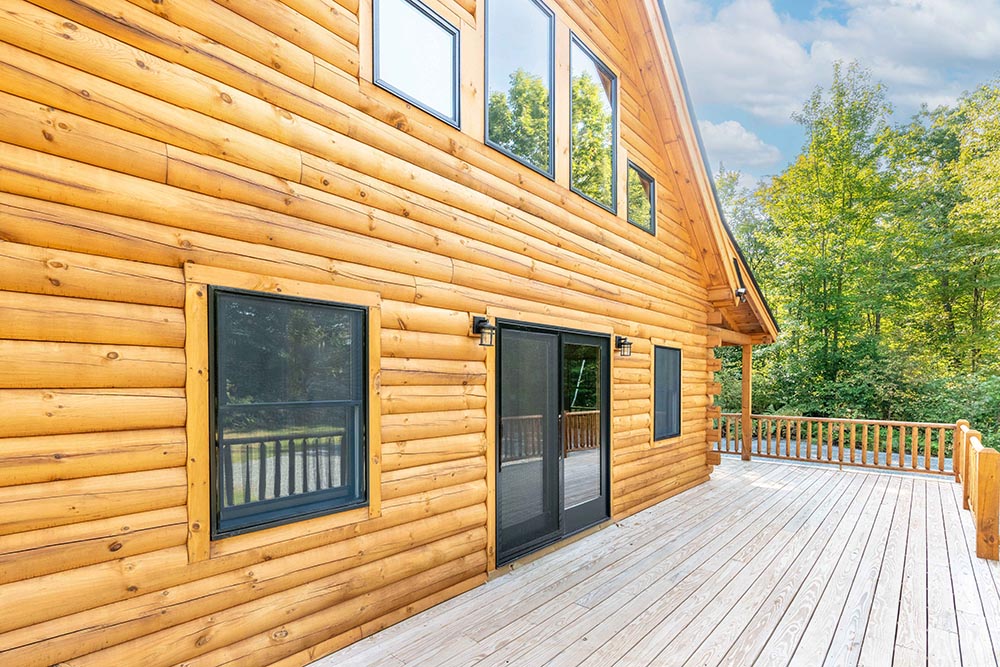 A practical take on one of our most popular log home designs, this model offers a covered front porch and open deck for outdoor living opportunities. The entrance opens to a cathedral ceiling over the living area. A shed dormer on one side and a wide gable dormer on the other, boosts its functionality and aesthetic value to the upstairs bedrooms. The master suite is on the first floor and conveniently has an adjoining walk-in closet as you enter the master bath.