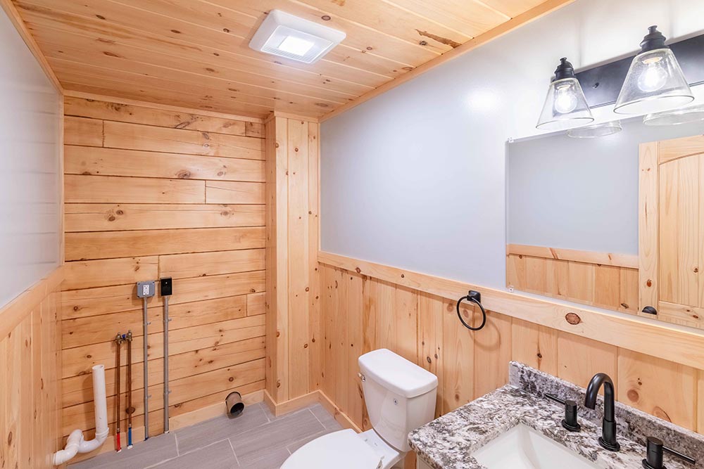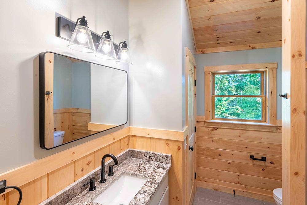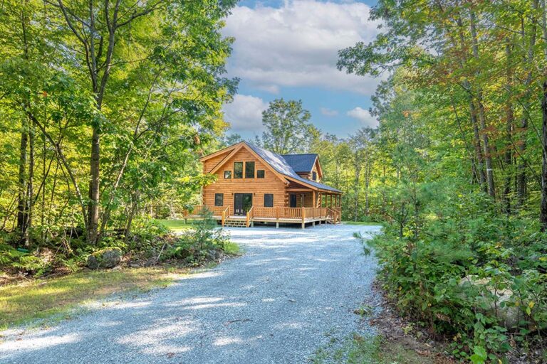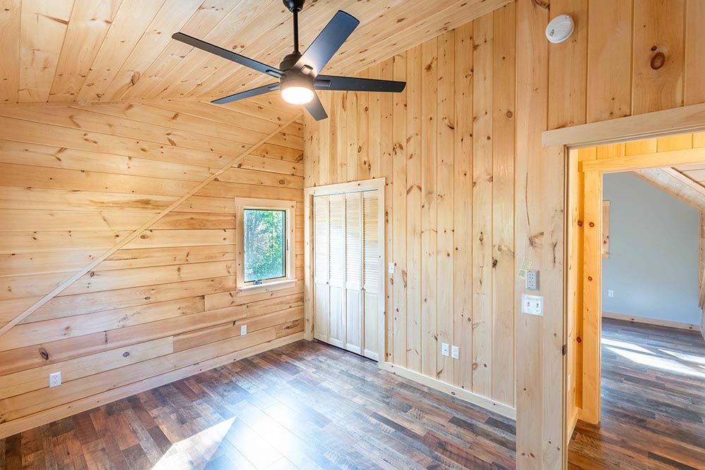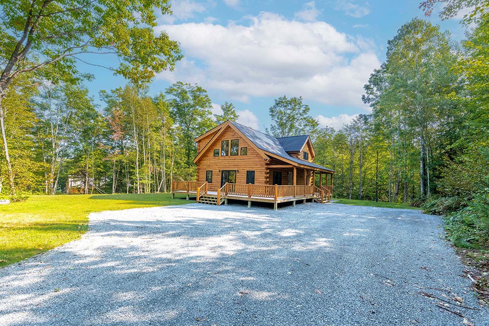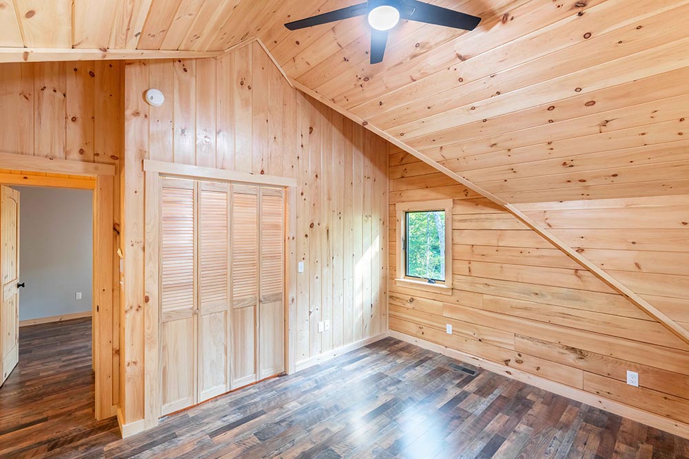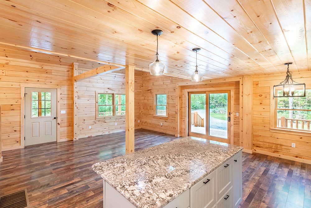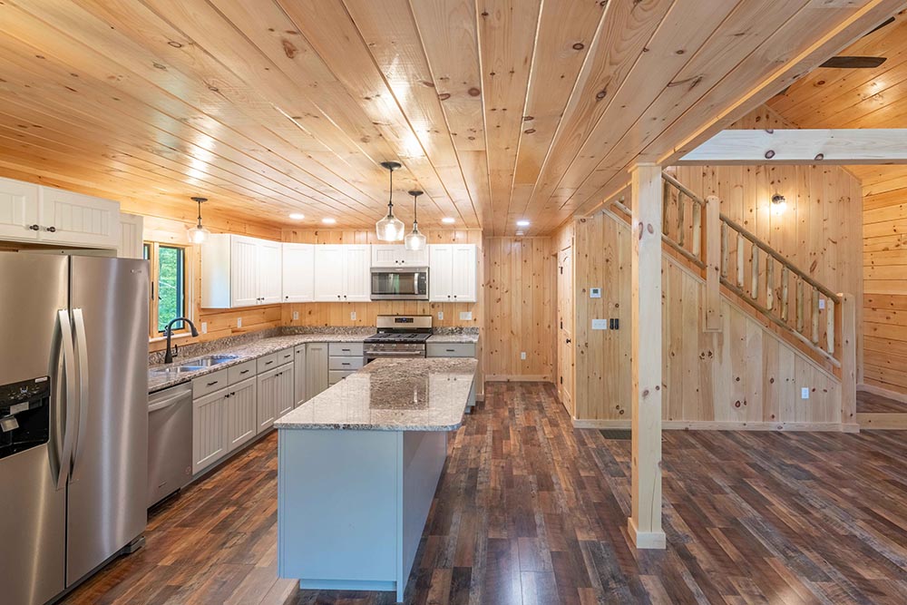 A practical take on one of our most popular log home designs, this model offers a covered front porch and open deck for outdoor living opportunities. The entrance opens to a cathedral ceiling over the living area. A shed dormer on one side and a wide gable dormer on the other, boosts its functionality and aesthetic value to the upstairs bedrooms. The master suite is on the first floor and conveniently has an adjoining walk-in closet as you enter the master bath.