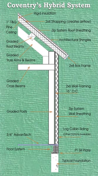 2x6 Traditional Wall Framing 16” O.C. • Zip System Wall Sheathing • Zip Wall Tape • Log Siding With Corner Extensions (standard) • Many Other Exterior Siding Options • Interior Wall Supplied With T&G to Finish