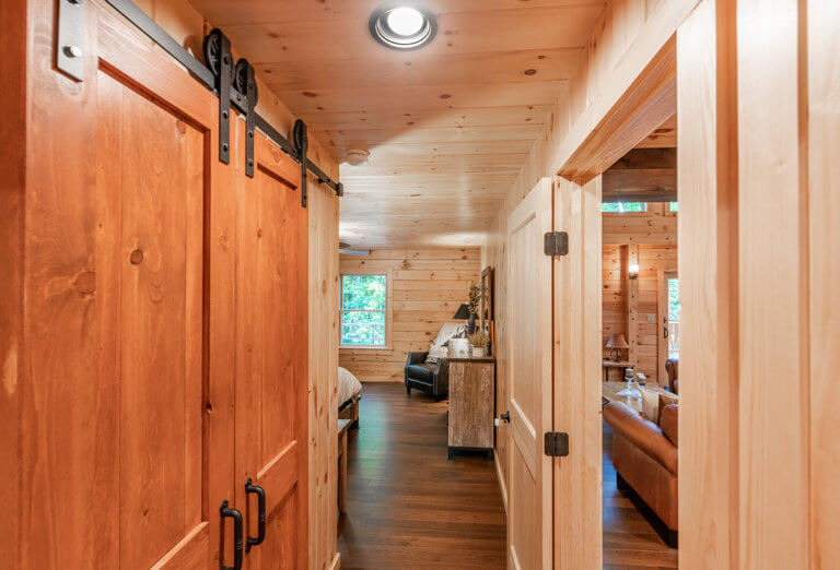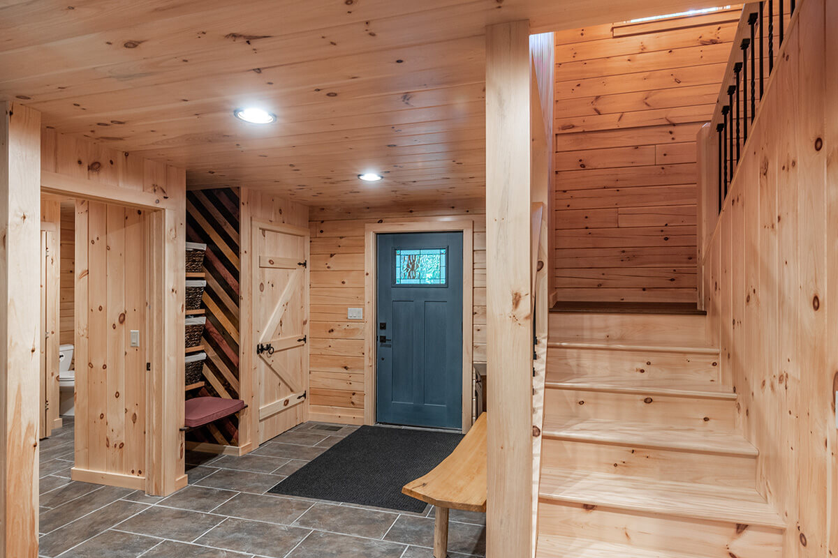 The Cascade model has an efficient and dramatic entrance with a scissor-switch staircase to the left and a coat closet to the right. The bathroom is conveniently located near the entry as well and the view to the open concept space shows the wall of windows that looks dramatic day or night. The open loft area acts as a hallway to three upstairs bedrooms and a bath. Outdoor spaces include a covered porch and an open deck.