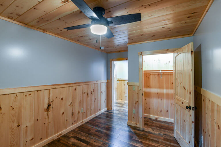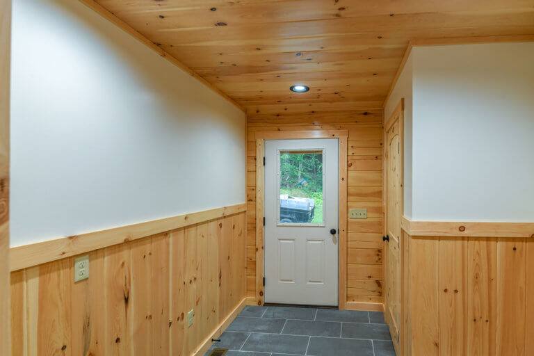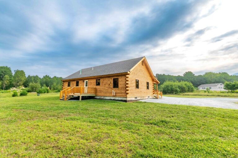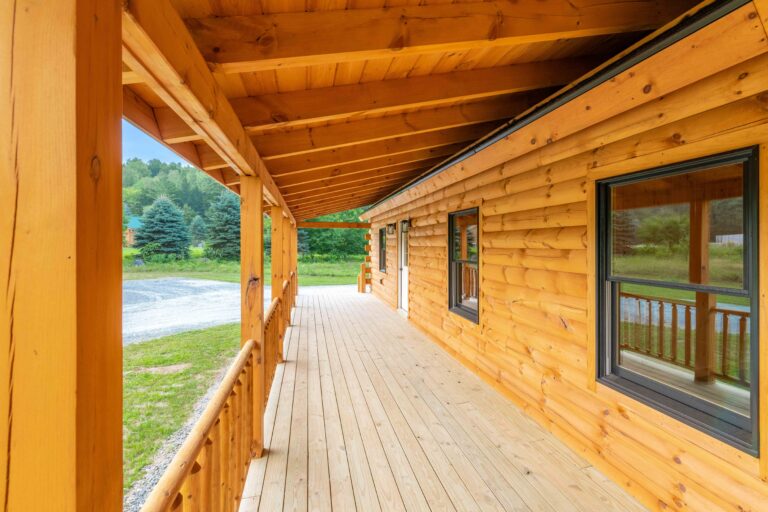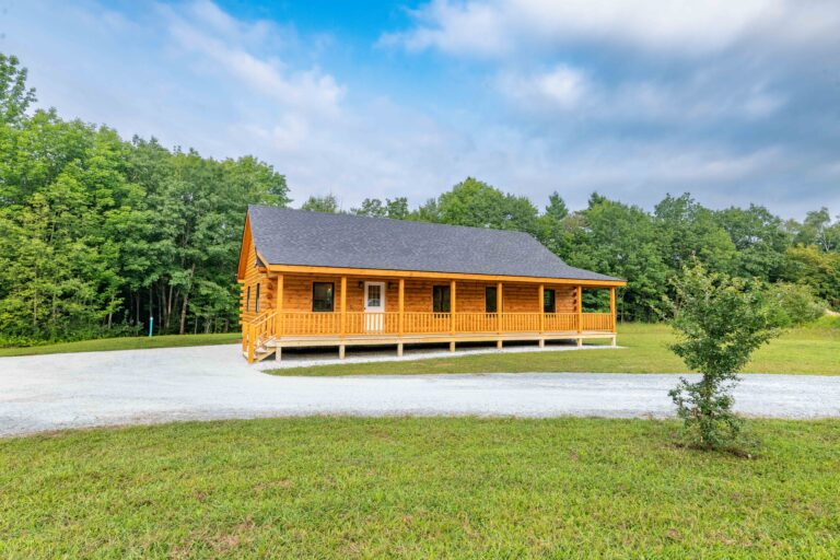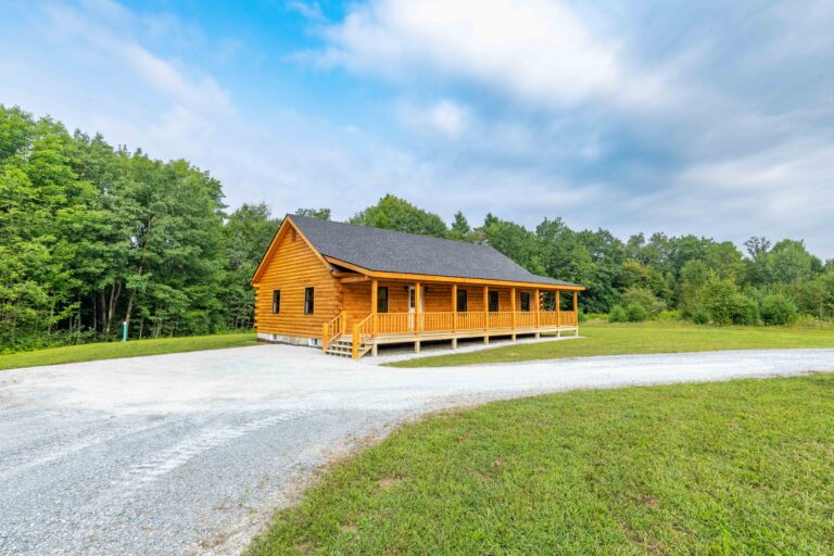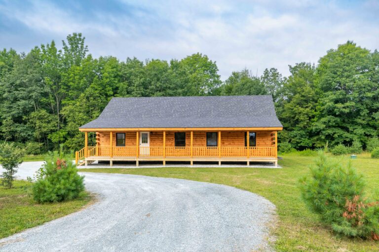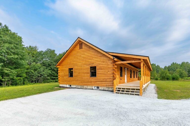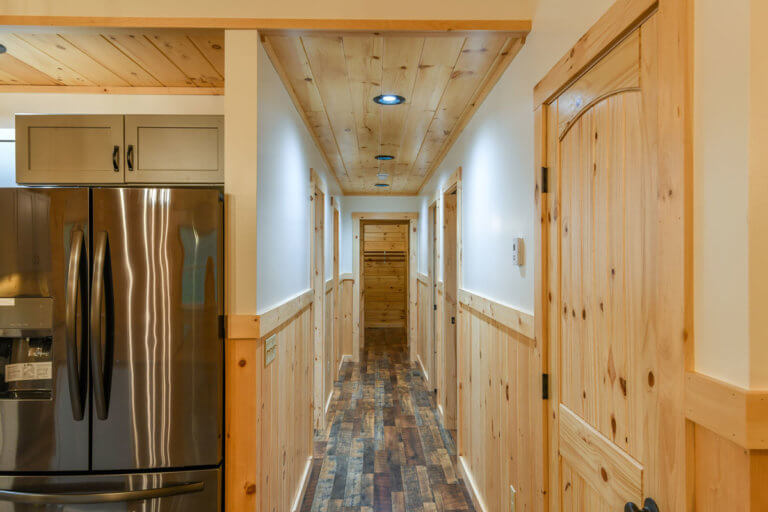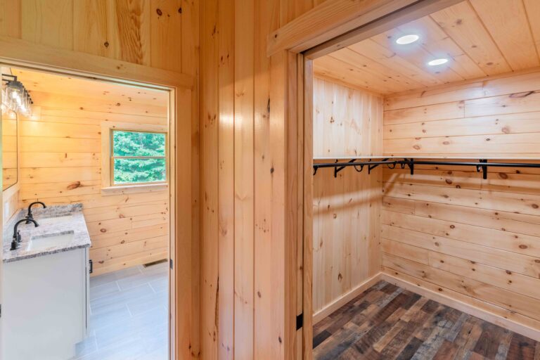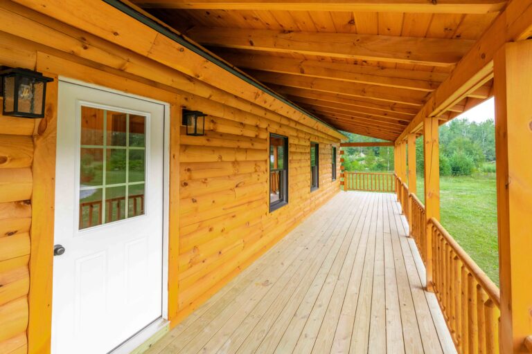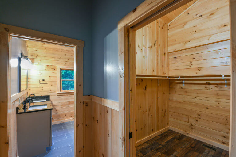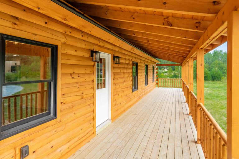 The Ammonoosuc model has the quintessential log cabin look. This one-story living arrangement is perfect for a family, but the two same-size bedrooms could also be converted for other space options. The clean efficient space is due in part to the pocket doors throughout, so walls are unobstructed by swingout doors. There are plenty of closets, one at each entry and one in each bedroom. The master suite takes up one end of the home for private getaway luxury. But the separate walled-in entry from the back with laundry space will be appreciated by all members of the home. Family and friends will enjoy the full length covered porch.