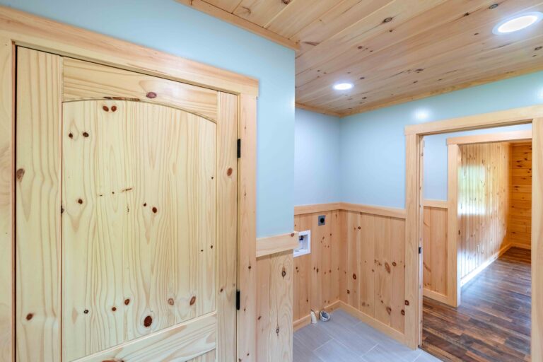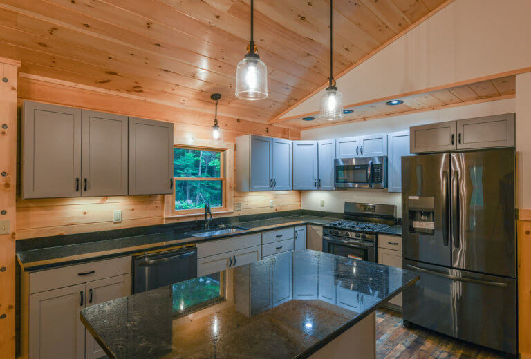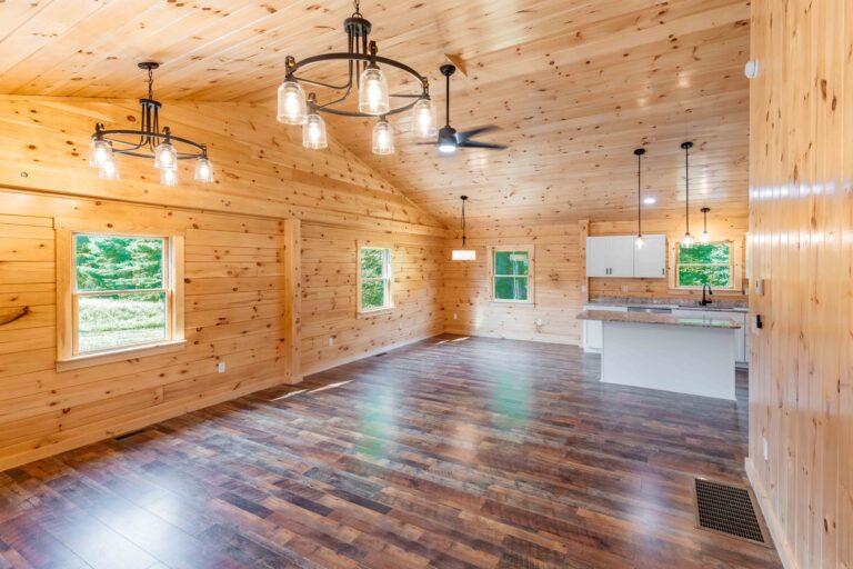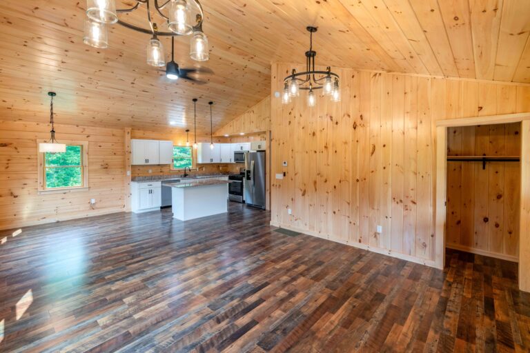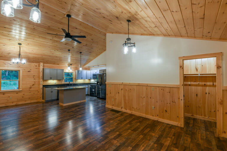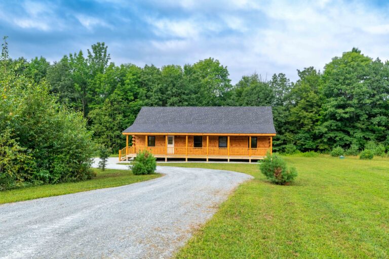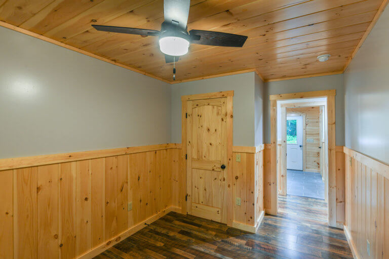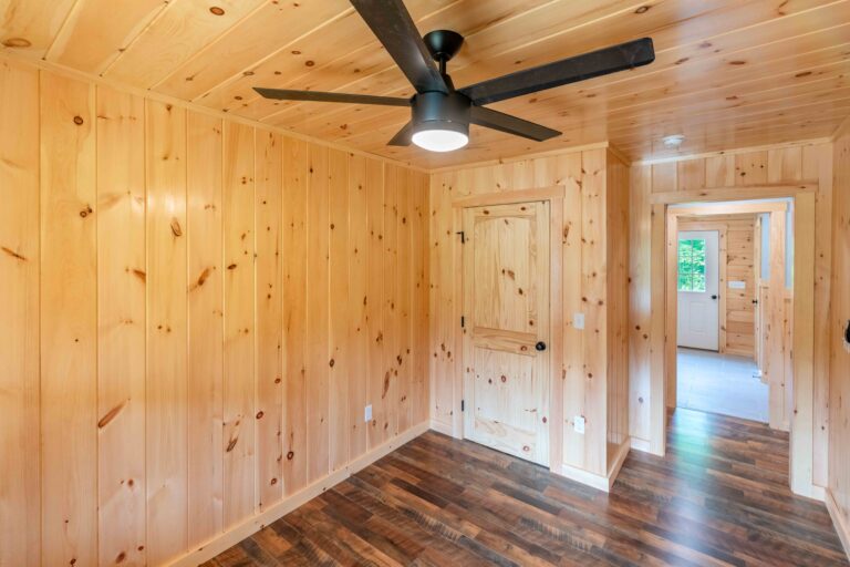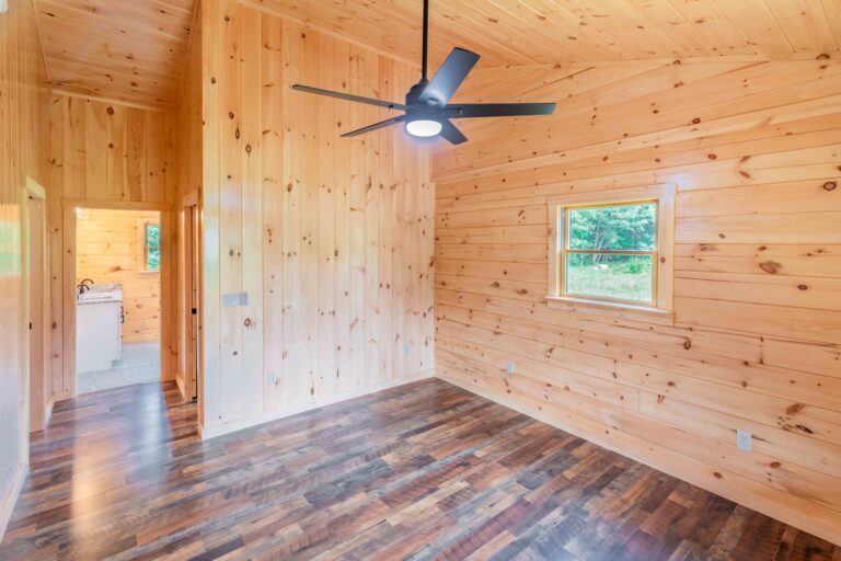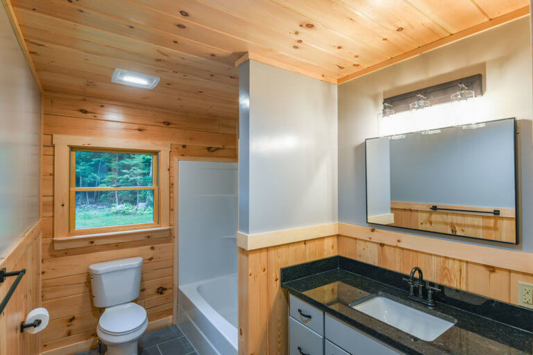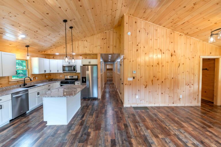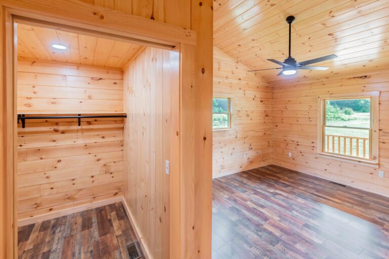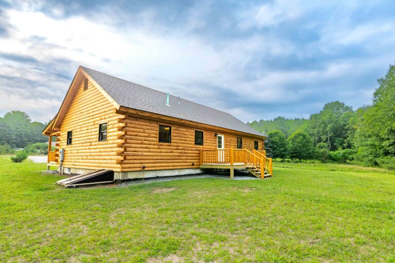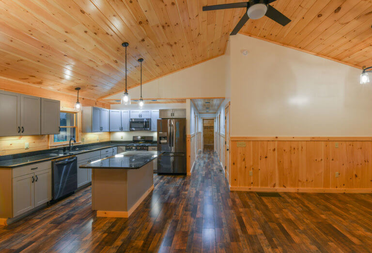 The Ammonoosuc model has the quintessential log cabin look. This one-story living arrangement is perfect for a family, but the two same-size bedrooms could also be converted for other space options. The clean efficient space is due in part to the pocket doors throughout, so walls are unobstructed by swingout doors. There are plenty of closets, one at each entry and one in each bedroom. The master suite takes up one end of the home for private getaway luxury. But the separate walled-in entry from the back with laundry space will be appreciated by all members of the home. Family and friends will enjoy the full length covered porch.