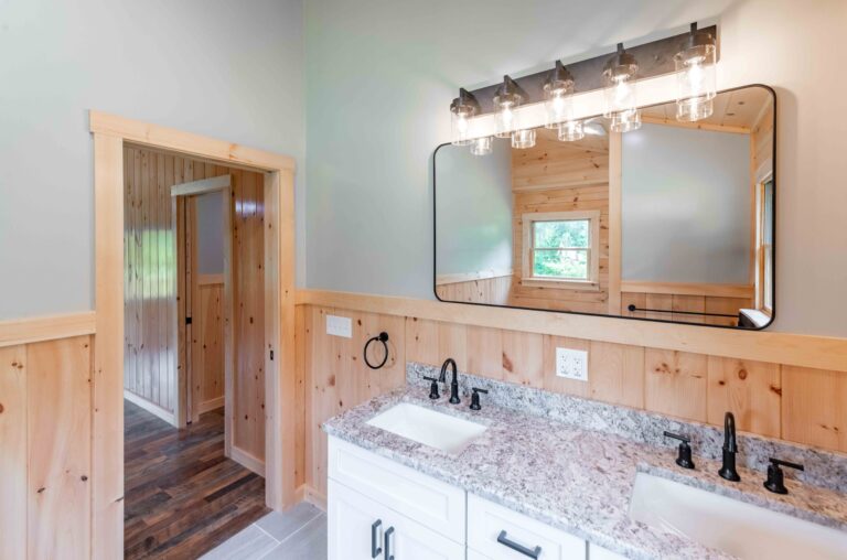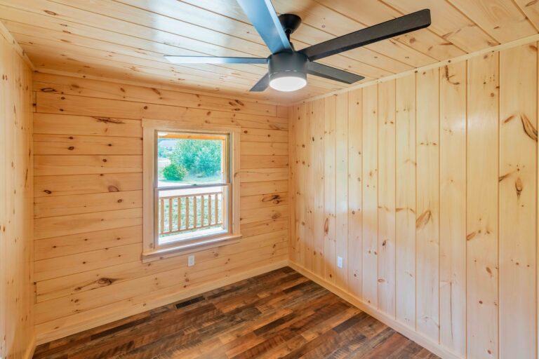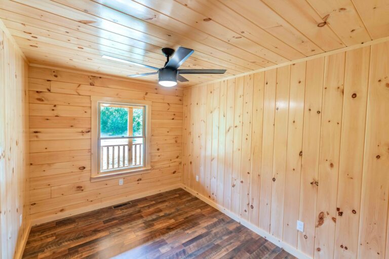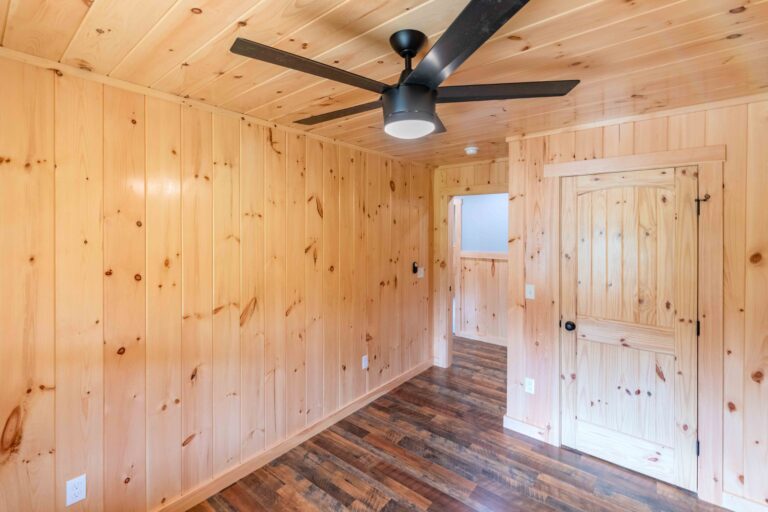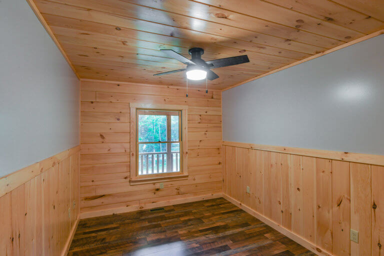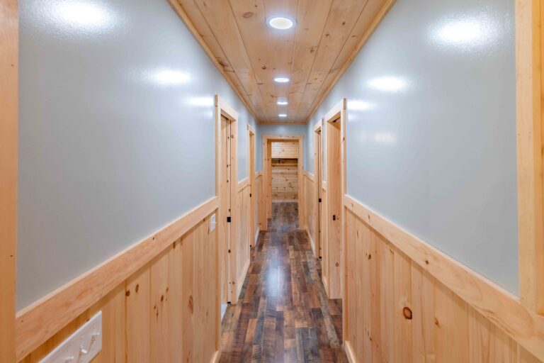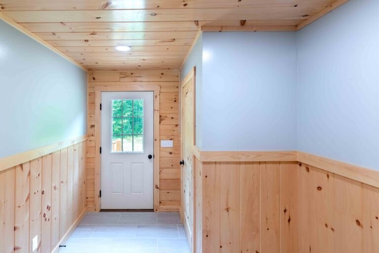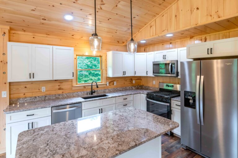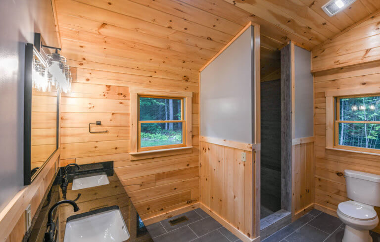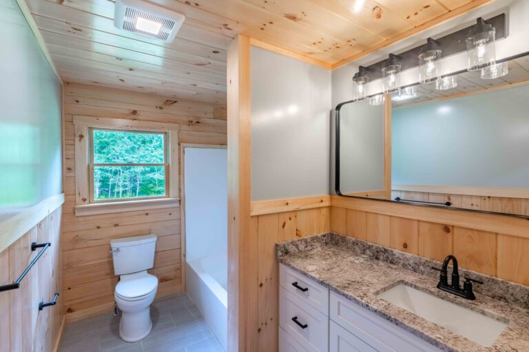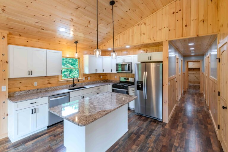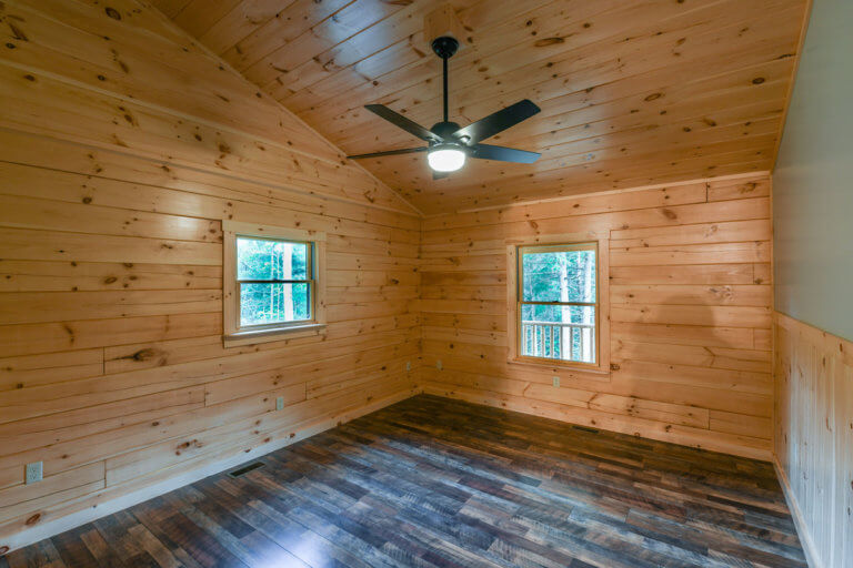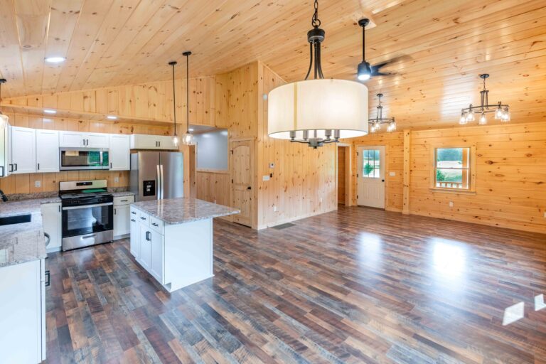 The Ammonoosuc model has the quintessential log cabin look. This one-story living arrangement is perfect for a family, but the two same-size bedrooms could also be converted for other space options. The clean efficient space is due in part to the pocket doors throughout, so walls are unobstructed by swingout doors. There are plenty of closets, one at each entry and one in each bedroom. The master suite takes up one end of the home for private getaway luxury. But the separate walled-in entry from the back with laundry space will be appreciated by all members of the home. Family and friends will enjoy the full length covered porch.
